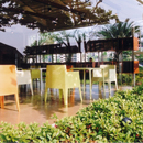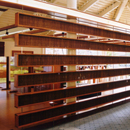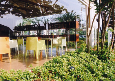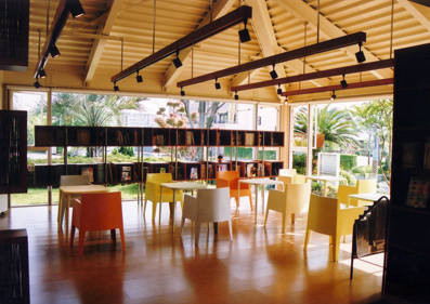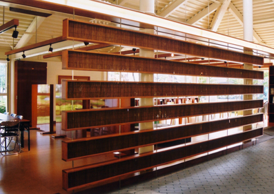 大阪郊外の住宅展示場の情報センター棟の改修。弱々しげな葦を並べた木製ルーバーにより、