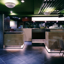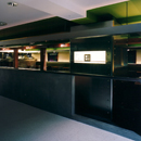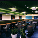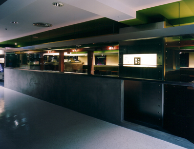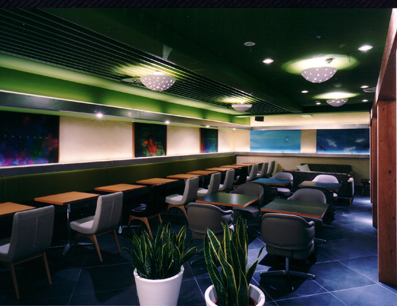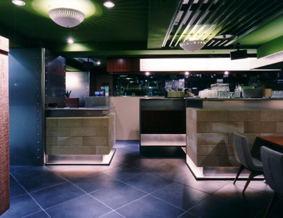 直線的なモルタルの腰壁とガラスによってフロアー通路と明確に仕切ることで 百貨店内においても落ち着いたカフェ空間の実現を図っている。